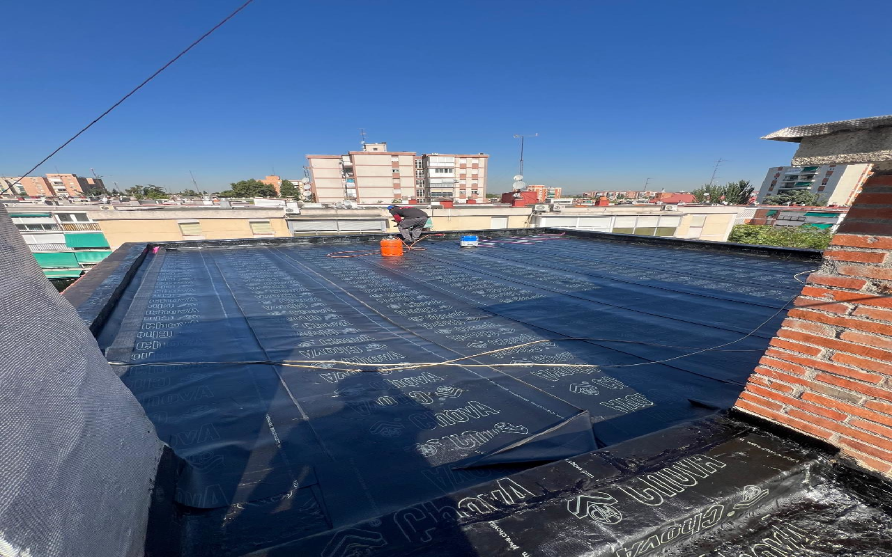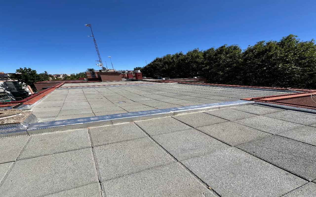 En esta intervención, respecto a la cubierta, se llevó a cabo un trabajo de retirada de tela asfáltica antigua, con el posterior suministro y colocación de impermeabilización bicapa, en suelo de cubierta, constituida por imprimación asfáltica tipo Emufal I, o producto similar, lámina asfáltica de betún elastómero SBS Glasdan 30 P Elast con armadura de fieltro de fibra de vidrio, adherida al soporte con soplete, y una segunda lámina asfáltica de betún elastómero SBS Esterdan 30 P Elast.